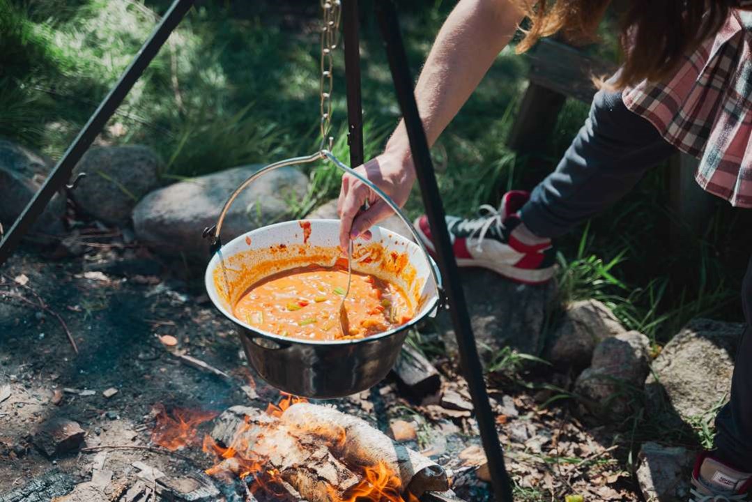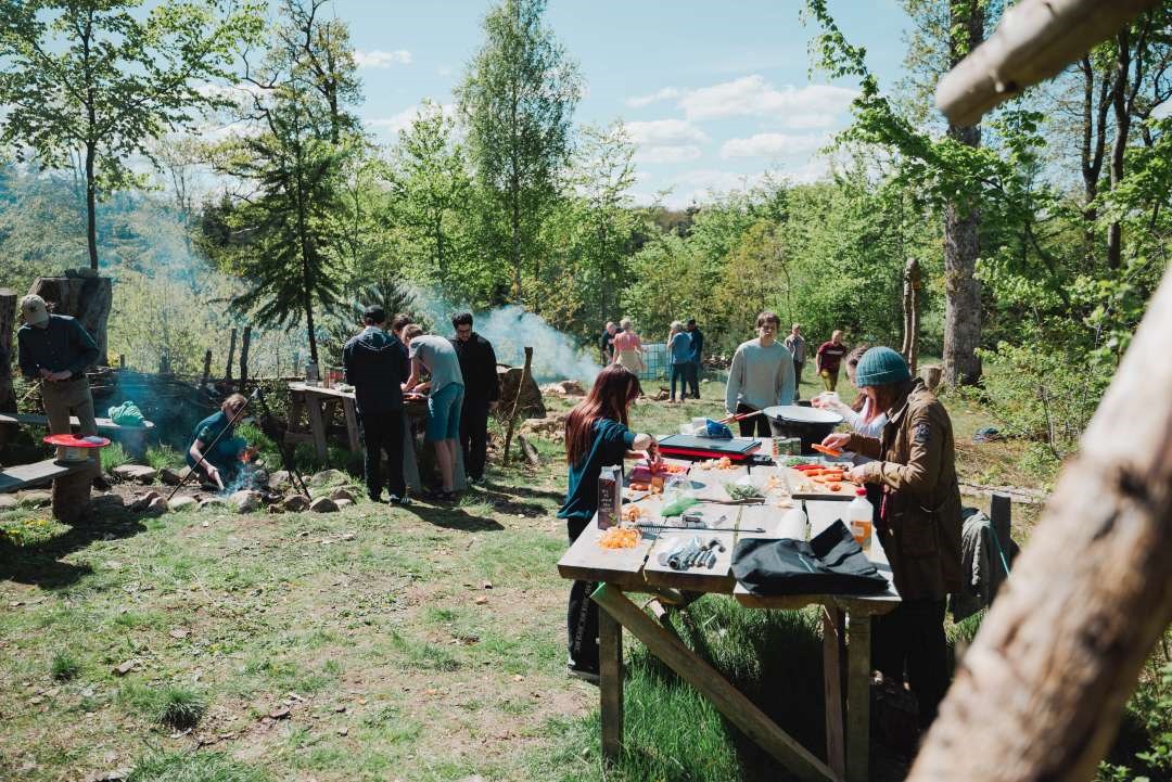 Over flammerne skulle de lave en suppe, og opskriften fik de mundtligt. Heldigvis var der rum til egen fortolkning og øvelsen i at skabe en ret fra bunden i et vildmarkskøkken viste sig at være en god samarbejdsøvelse.