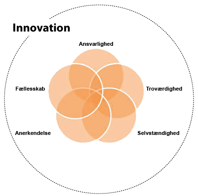 Vi stiller os aldrig tilfredse med at gøre tingene, som vi plejer. Innovation er gode ideer, der bliver anvendt og skaber værdi (omsætning) eller på anden måde stiller vores organisation bedre. Innovation er nye produkter, men også nye services og nye interne arbejdsgange. Vi er kreative, innovative og har evnen til at opnå succes sammen.